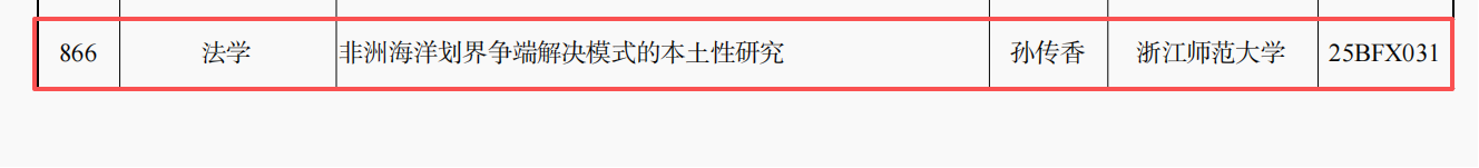 9月29日,全国哲学社会科学工作办公室发布了《2025年国家社会科学基金年度项目立项结果公布》,我院孙传香教授申报的《非洲海洋划界争端解决模式的本土性研究》获国家社会科学基金一般项目立项。