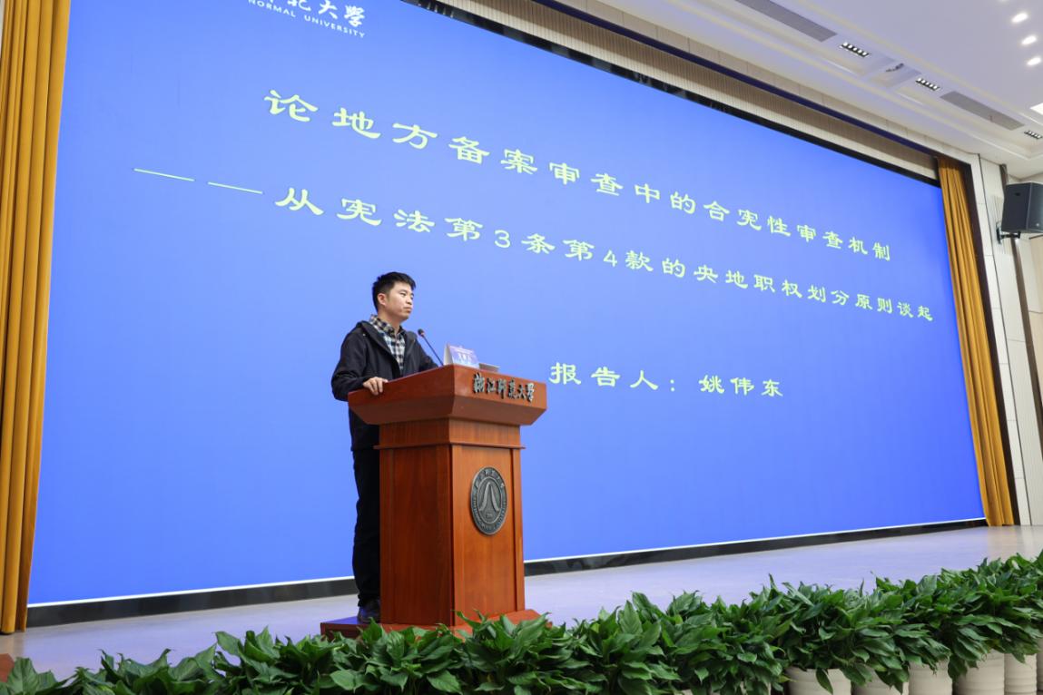 其次,浙江师范大学法学院姚伟东博士和义乌市人大常委会法制和监督司法工委陈凯副主任代表获奖论文作者作主题报告。姚伟东从宪法第三条第四款的央地职权划分原则,探讨地方备案审查中的合宪性审查机制;陈凯以社区参与立法意见征询活动为视角,探究基层立法联系点建设进社区的实践路径。省人大常委会法工委主任田梦海、西南政法大学教授梁洪霞对二人的汇报进行了评议,在肯定他们研究成果的同时,也指出部分问题还可进一步深入探讨。